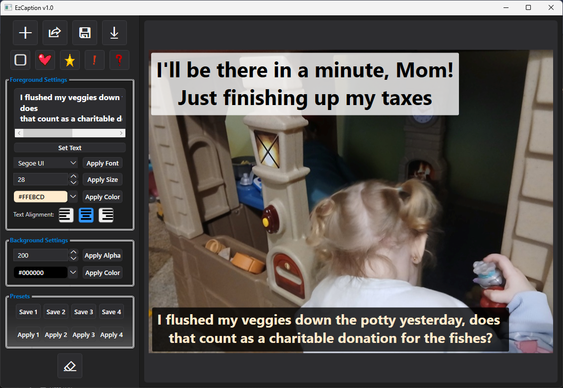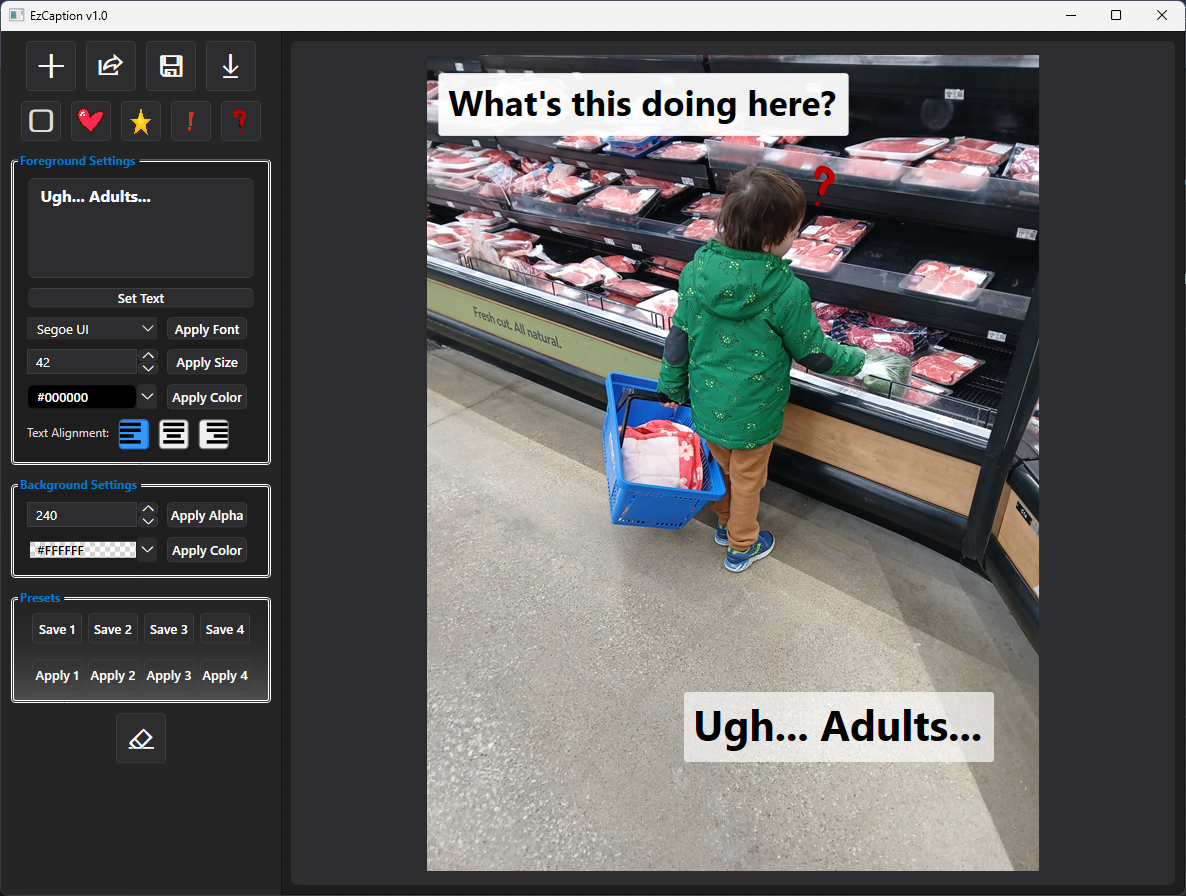 EzCaption is an image editing tool for Windows. It specializes in overlaying text and icons on top of existing images. If you are looking for a way to simplify adding captions or undirected speech bubbles to images, then this tool is for you.
